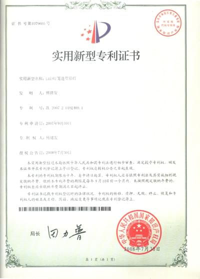 大旗燈飾自主研發(fā)的LED“燭形燈泡”,正式獲得“實用新型專利證書”(專利號:ZL 2007 2 0101412.X)...