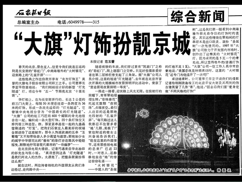 在香港和澳門回歸、建國五十周年、迎新千年等重大喜慶節(jié)日里,將夜幕下的首都北京裝點得流光溢彩、華美壯觀的大型現代燈飾,原來出自我市“大旗”公司的能工巧匠之手。...